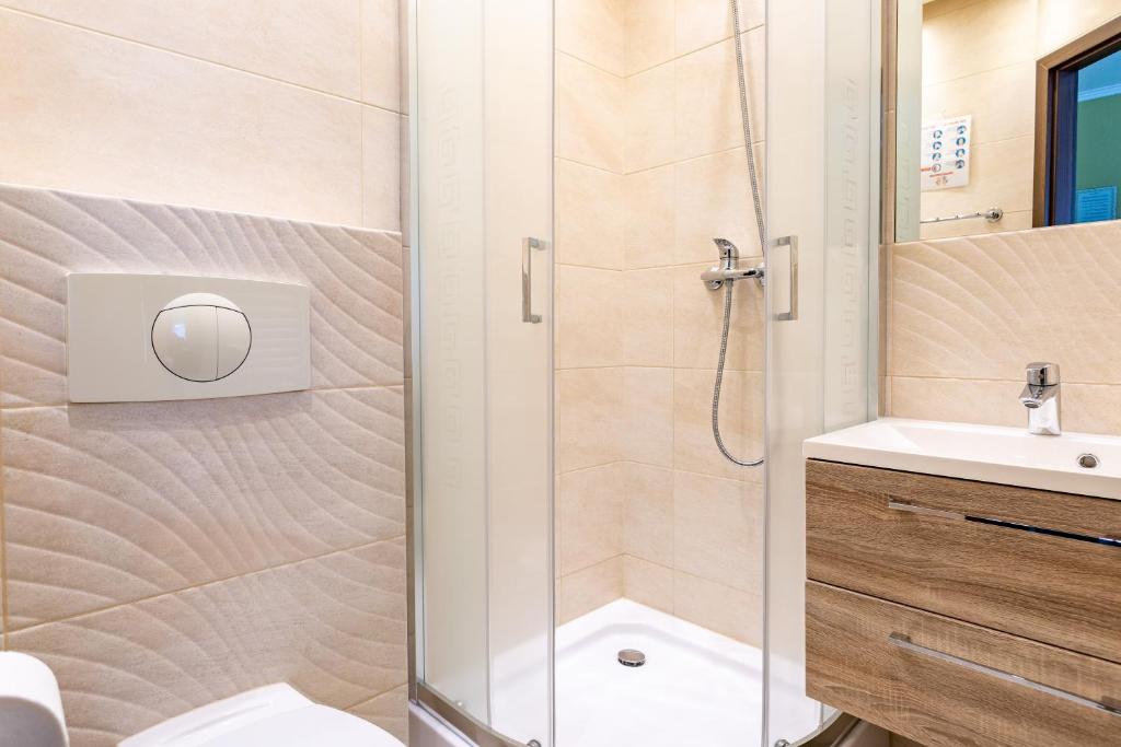 Apartament z 2 sypialniami. This apartment comes with 1 living room, 2 separate bedrooms and 1 bathroom with a shower. The apartments kitchenette, which has a refrigerator and kitchenware, is available for cooking and storing food. The apartment features a wardrobe, an electric kettle, a carpeted floor, heating and a flat-screen TV with satellite channels. The unit has 4 beds. Apartament - 5 osobowy. Powierzchnia pokoju ok.: 37 mkw. ;