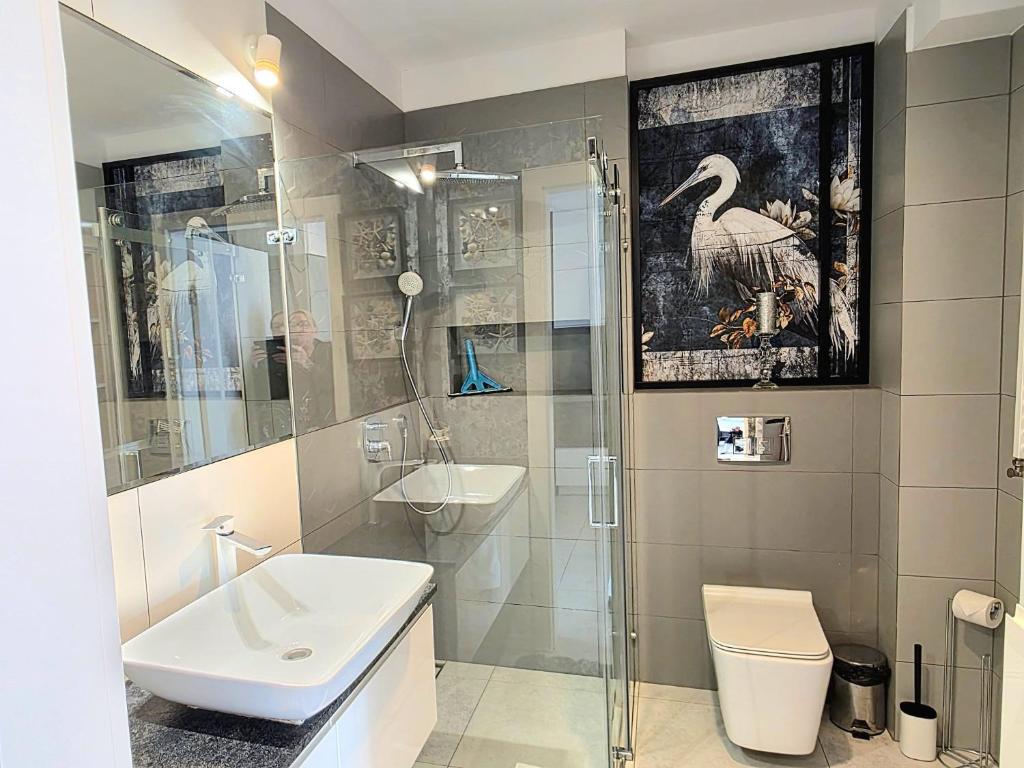 Apartament z widokiem na morze. This apartment features 1 living room, 1 separate bedroom and 1 bathroom with a walk-in shower and a hairdryer. In the well-fitted kitchen, guests will find a stovetop, a refrigerator, a dishwasher and kitchenware. This wheelchair accessible apartment has a washing machine, a seating area with a flat-screen TV and a roll-in shower. The unit has 2 beds. Powierzchnia pokoju ok.: 38 mkw.