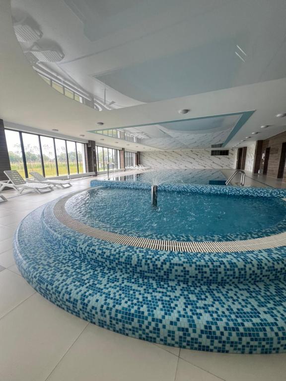 Zaplecze odnowy biologicznej obiektu Apartament Dziwnów White & Gold obejmuje kryty basen, saunę i wannę z hydromasażem.