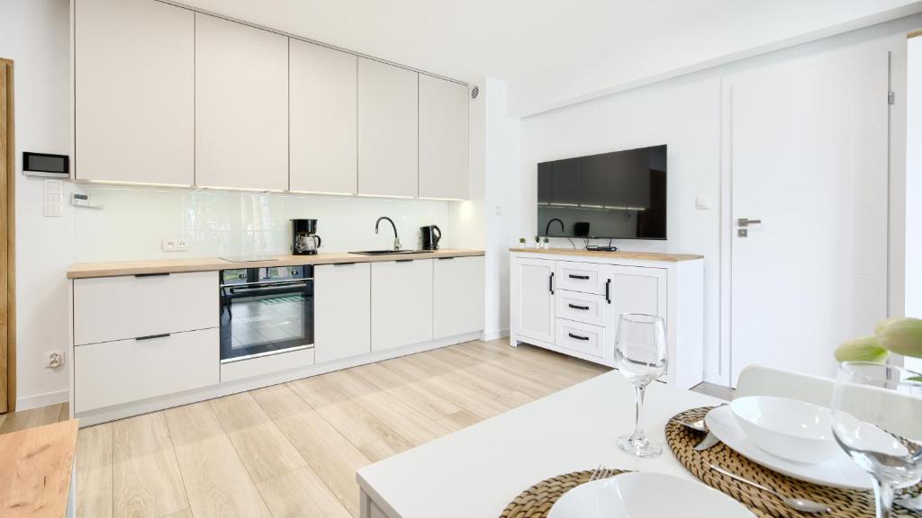 W apartamencie znajduje się telewizor z płaskim ekranem. Wyposażenie aneksu kuchennego obejmuje lodówkę, zmywarkę, piekarnik, a także ekspres do kawy i czajnik.