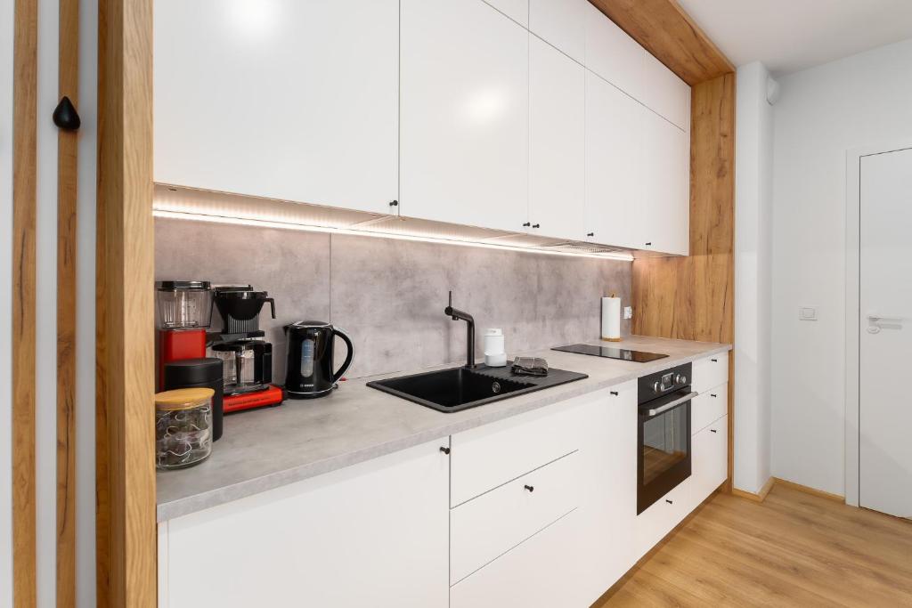 Apartament znajduje się na parterze. Na miejscu zapewniono sypialnię (1), telewizor z płaskim ekranem z dostępem do kanałów kablowych oraz aneks kuchenny z pełnym wyposażeniem, w tym lodówką, zmywarką, pralką, piekarnikiem i płytą kuchenną. W apartamencie zapewniono ręczniki i pościel.