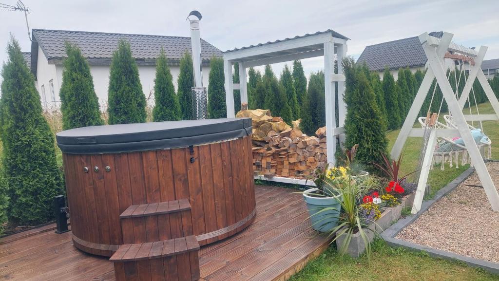 Dom z 2 sypialniami. Guests will find a stovetop, a refrigerator, kitchenware and a microwave in the well-fitted kitchen. The holiday home also offers a barbecue. The holiday home provides a private entrance, a seating area, a terrace with garden views as well as a shared bathroom featuring a shower. The unit offers 4 beds. Dom wakacyjny - 6 osobowy. Powierzchnia pokoju ok.: 10 mkw.