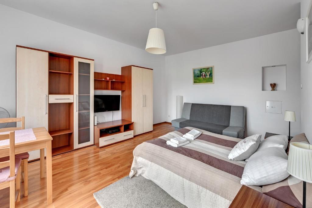 Apartament typu studio. The fully equipped kitchenette features a stovetop, a refrigerator, a dishwasher and kitchenware. The apartment provides a washing machine, a private entrance, a balcony with city views as well as a private bathroom featuring a shower. The unit offers 2 beds. Apartament - 4 osobowy. Powierzchnia pokoju ok.: 35 mkw.
