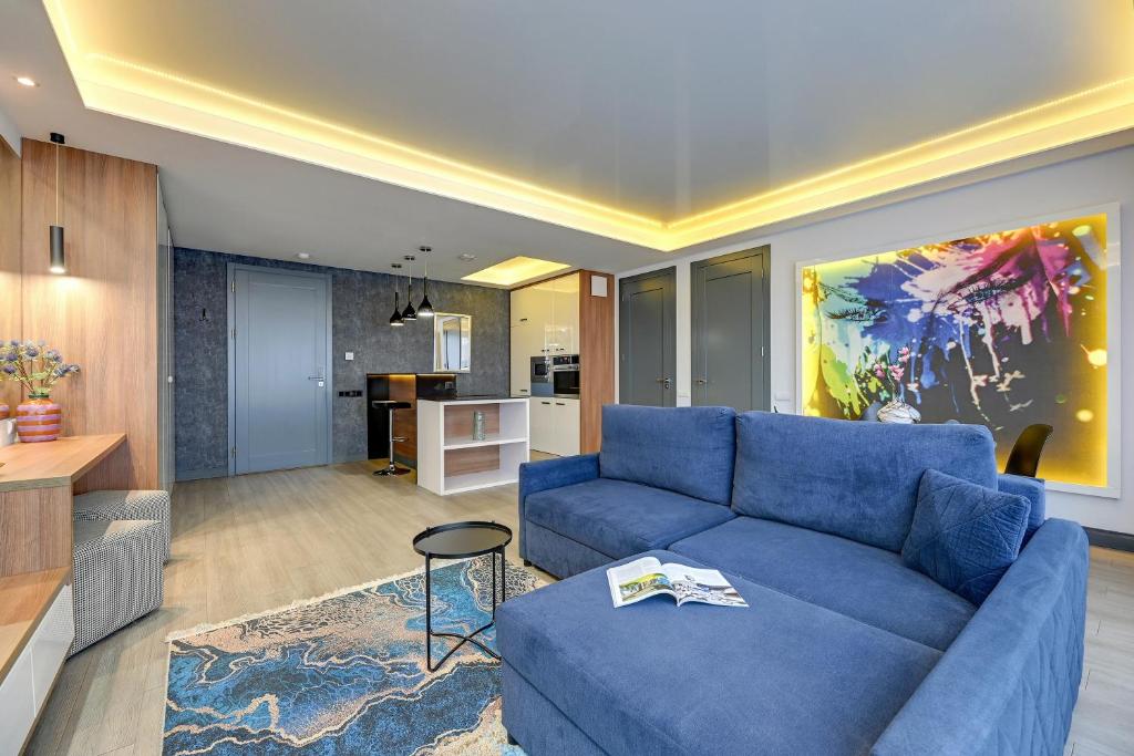 Apartament typu Deluxe Suite. Featuring a private entrance, this suite is comprised of 1 living room, 1 separate bedroom and 1 bathroom with a shower and a hairdryer. In the fully equipped kitchenette, guests will find a stovetop, a refrigerator, kitchenware and an oven. The suite features parquet floors, a seating area with a flat-screen TV with cable channels, a tea and coffee maker, a wardrobe, as well as a sofa. The unit offers 2 beds. Powierzchnia pokoju ok.: 45 mkw.