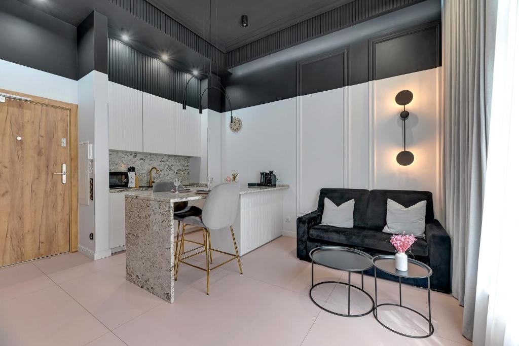 Oferta apartamentu obejmuje sypialnię (1), salon, aneks kuchenny z pełnym wyposażeniem, w tym lodówką i ekspresem do kawy, a także łazienkę (1) z prysznicem oraz bezpłatnym zestawem kosmetyków. W apartamencie zapewniono ręczniki i pościel.
