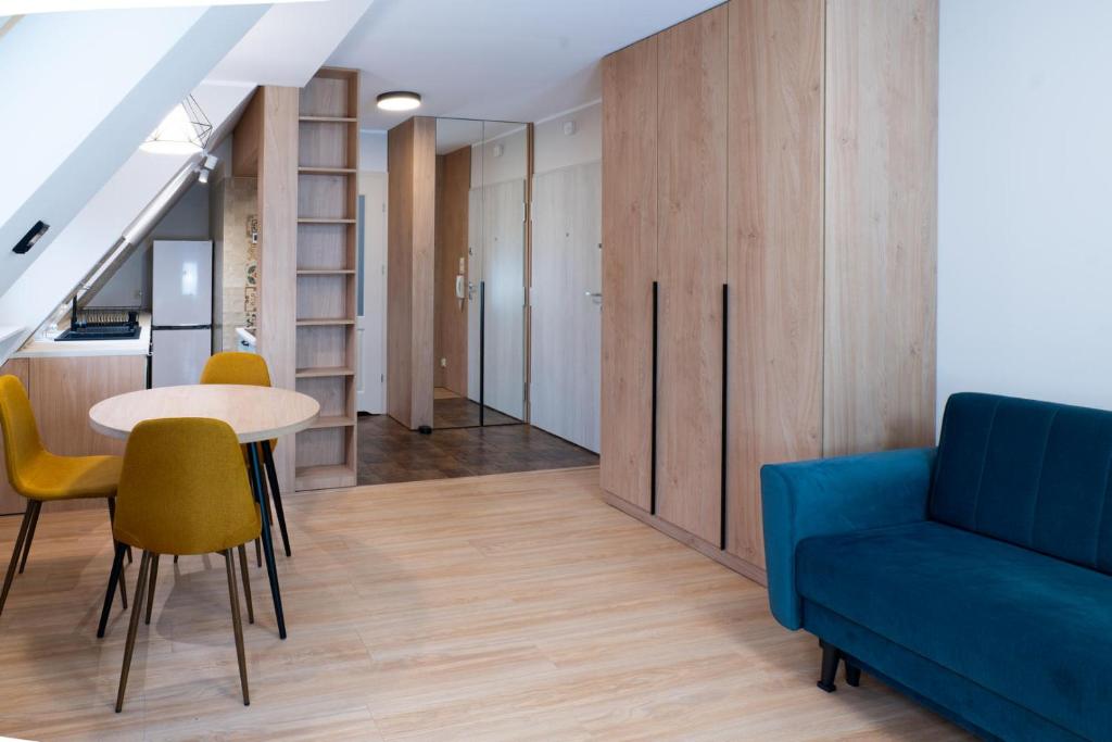 Studio z rozkładaną sofą. Guests can make meals in the kitchenette that is fitted with a stovetop, a refrigerator, a dishwasher and kitchenware. The studio offers a washing machine, a private entrance, as well as a private bathroom featuring a shower and a hairdryer. The unit offers 1 bed. Powierzchnia pokoju ok.: 25 mkw.