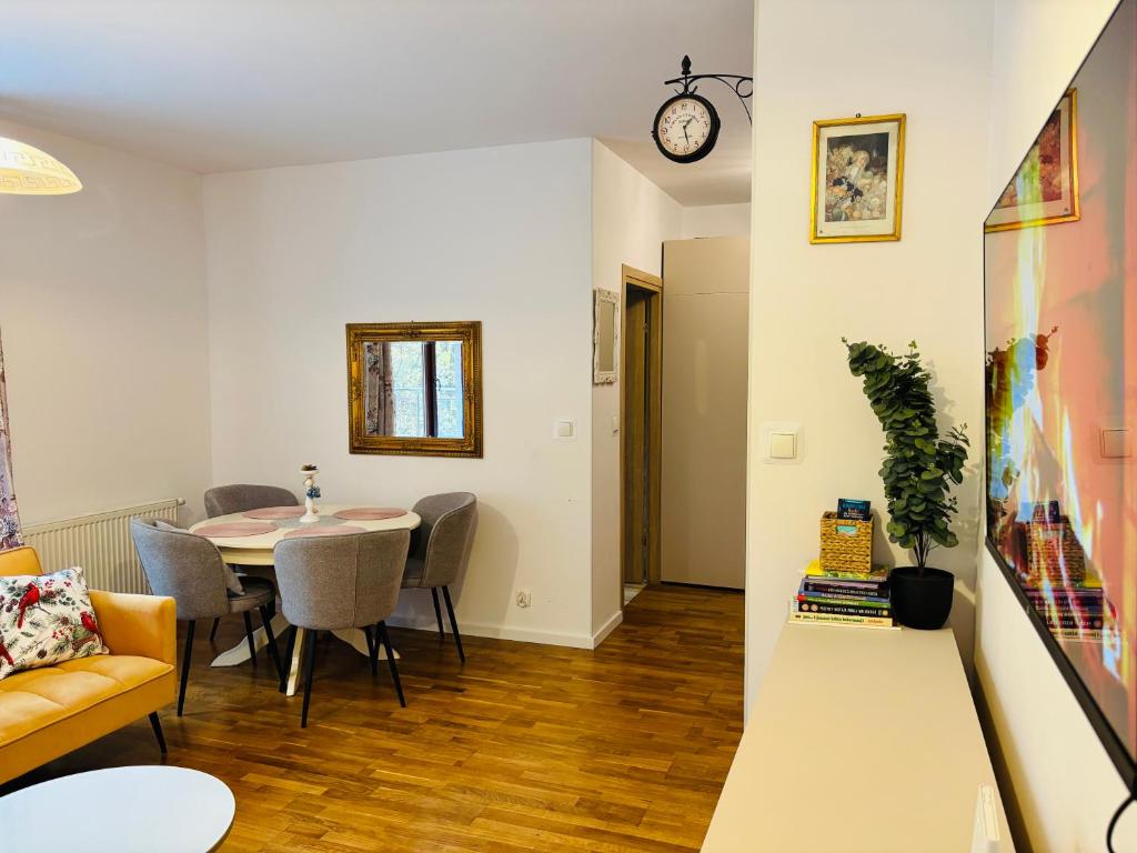 Apartament z 1 sypialnią. This apartment is comprised of 1 living room, 1 separate bedroom and 1 bathroom with a bath and a hairdryer. Featuring a terrace with garden views, this apartment also offers a washing machine and a flat-screen TV. The unit offers 3 beds. Apartament - 5 osobowy. Powierzchnia pokoju ok.: 40 mkw.
