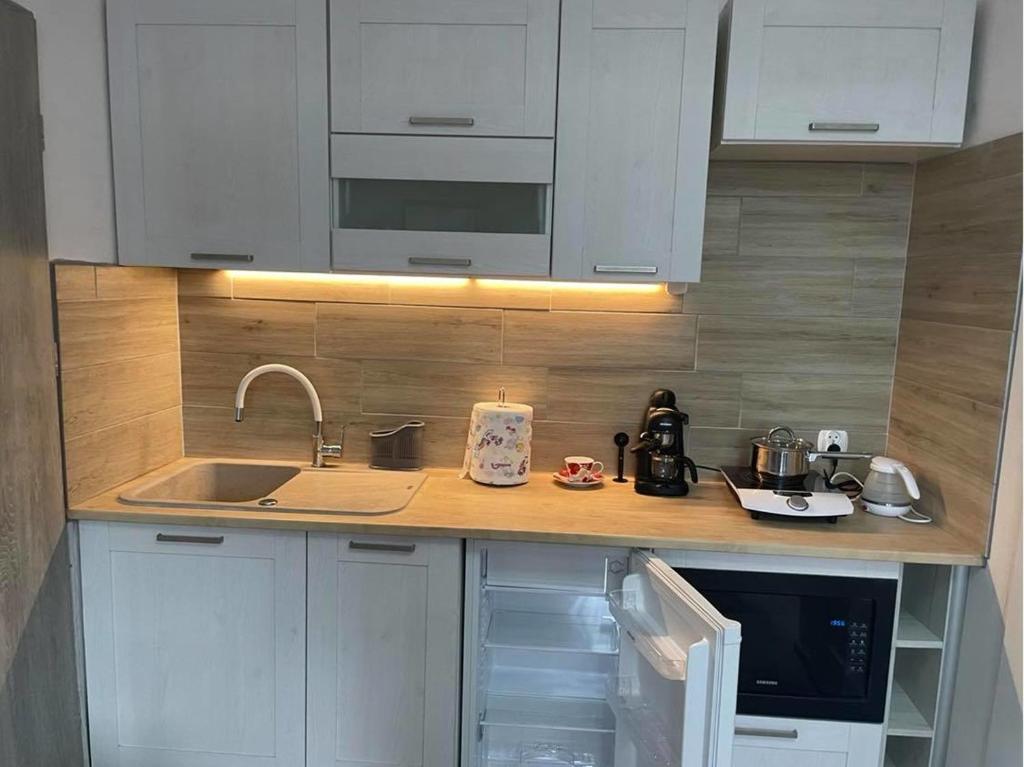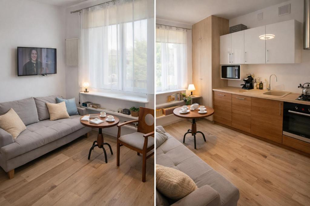 Apartament. Boasting a private entrance, this apartment includes 1 living room, 1 separate bedroom and 1 bathroom with a walk-in shower and a bidet. Guests can make meals in the kitchen that is fitted with a stovetop, a refrigerator, kitchenware and a microwave. The apartment offers a flat-screen TV, a tea and coffee maker, a wardrobe, a sofa as well as city views. The unit has 1 bed and 1 futon. Apartament - 3 osobowy. Powierzchnia pokoju ok.: 18 mkw.