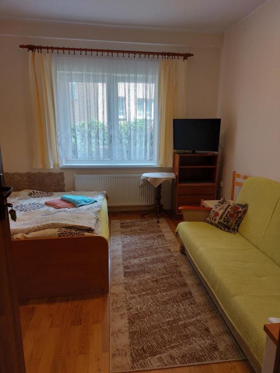 Pokój rodzinny typu Standard. The family room provides a dining area, a wardrobe, as well as a shared bathroom featuring a shower and a hairdryer. The family rooms kitchen is available for cooking and storing food. This family room features a sofa, parquet floors, a flat-screen TV and garden views. The unit offers 2 beds. Powierzchnia pokoju ok.: 17 mkw.