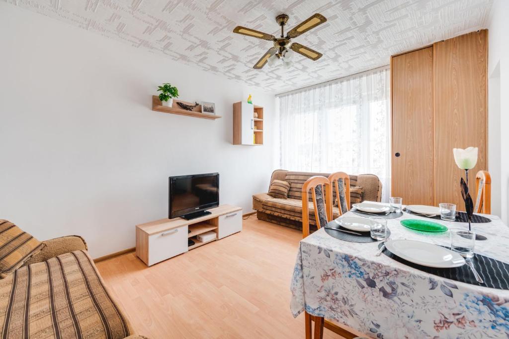 Apartament z 1 sypialnią. This apartment consists of 1 living room, 1 separate bedroom and 1 bathroom with a bath and a hairdryer. Guests can make meals in the kitchen that is equipped with a stovetop, a refrigerator, kitchenware and an oven. The apartment provides a TV, a washing machine, a dining area, a wardrobe as well as a quiet street view. The unit offers 2 beds. Powierzchnia pokoju ok.: 37 mkw.
