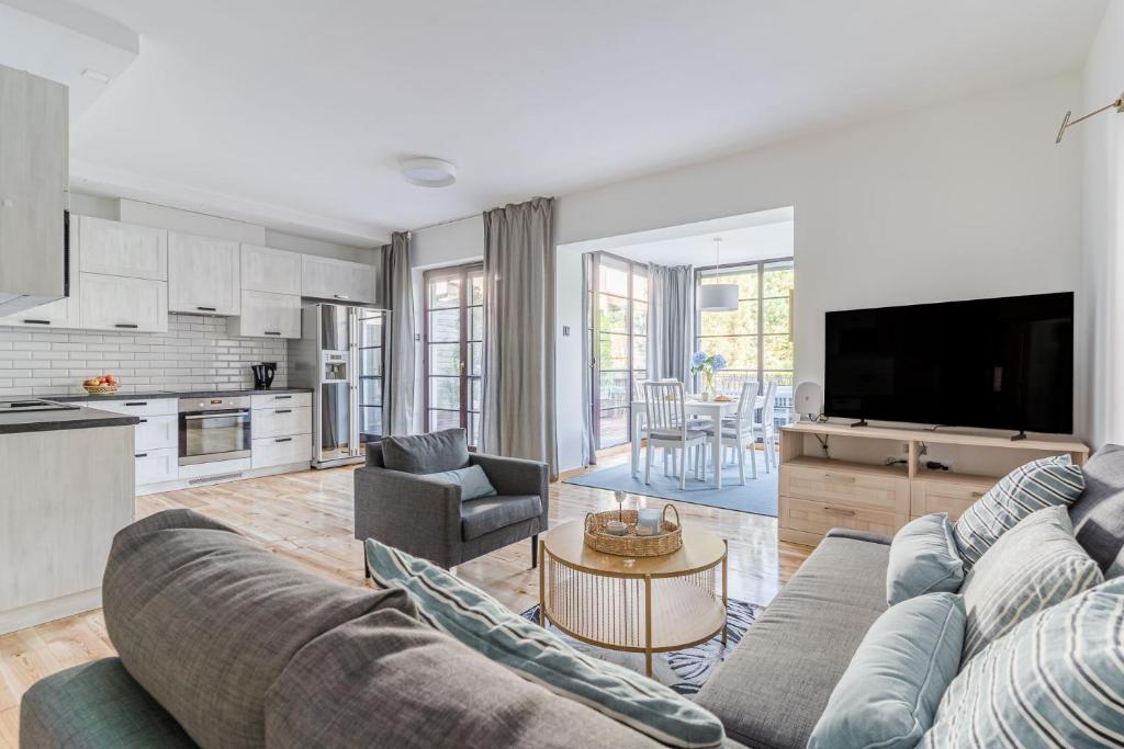 Apartament z 2 sypialniami. This spacious apartment consists of 1 living room, 2 separate bedrooms and 1 bathroom with a bath and free toiletries. Guests can make meals in the kitchenette that is equipped with a stovetop, a refrigerator, a dishwasher and kitchenware. Featuring a terrace with garden views, this apartment also provides a washing machine and a flat-screen TV. The unit offers 3 beds. Apartament - 6 osobowy. Powierzchnia pokoju ok.: 85 mkw.