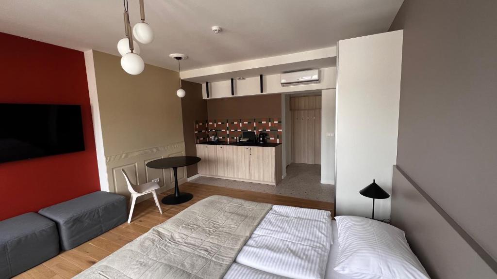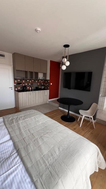 Apartament typu studio. This air-conditioned apartment includes 1 living room, 1 separate bedroom and 1 bathroom with a shower. Guests can make meals in the kitchenette that is fitted with a stovetop, a refrigerator and an electric kettle. Boasting a balcony with a quiet street view, this apartment also offers soundproof walls and a flat-screen TV. The unit has 1 bed and 1 futon. Apartament - 3 osobowy. Powierzchnia pokoju ok.: 24 mkw. ;