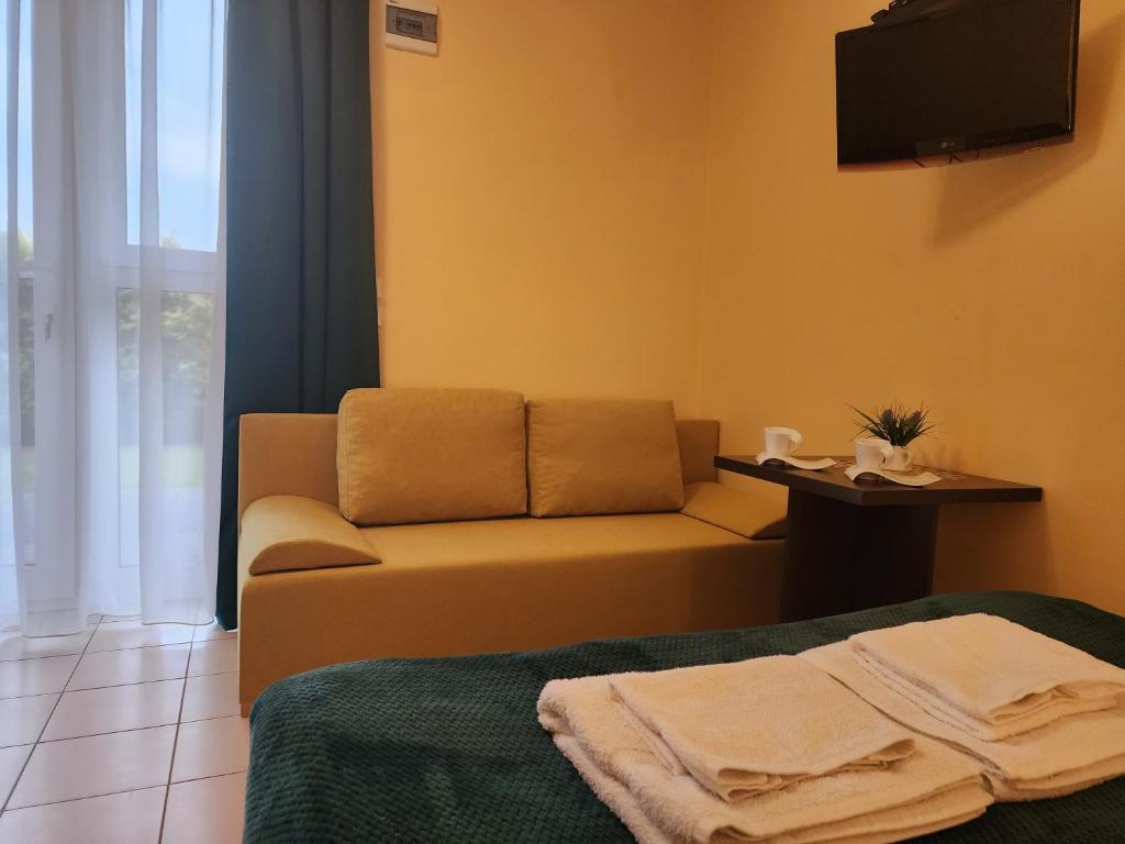 Pokój Trzyosobowy typu Comfort. This triple room includes a flat-screen TV with cable channels, a private bathroom as well as a terrace with garden views. The unit offers 2 beds. Pokój Trzyosobowy - 3 osobowy. Powierzchnia pokoju ok.: 18 mkw. ;