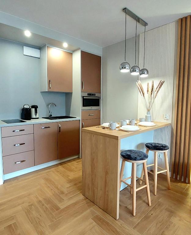 Apartament typu Deluxe. This apartment includes 1 living room, 1 separate bedroom and 1 bathroom with a shower and a hairdryer. In the well-fitted kitchen, guests will find a stovetop, a refrigerator, a dishwasher and kitchenware. Boasting a balcony with garden views, this apartment also offers a coffee machine and a flat-screen TV. The unit has 2 beds. Powierzchnia pokoju ok.: 31 mkw.