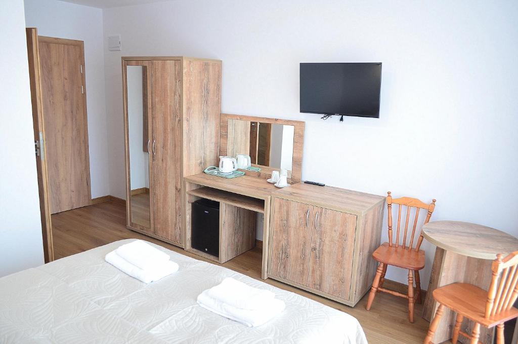 Pokój Dwuosobowy typu Deluxe. In the well-fitted kitchenette, guests will find a stovetop, a refrigerator, kitchenware and a tea and coffee maker. This double room is comprised of a flat-screen TV with cable channels, a private bathroom as well as a terrace with garden views. The unit has 1 bed. Pokój Dwuosobowy - 2 osobowy. Powierzchnia pokoju ok.: 16 mkw.