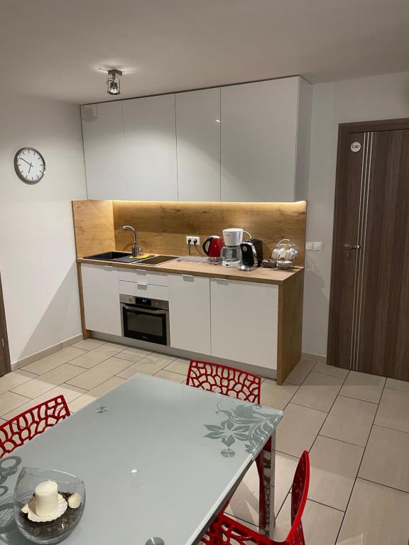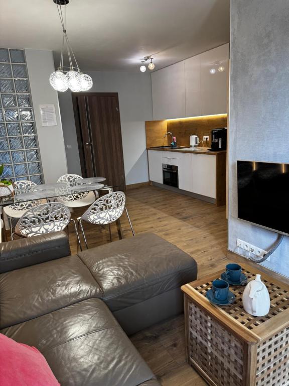 Apartament z 1 sypialnią. This apartment features a fireplace. This apartment comprises 1 living room, 1 separate bedroom and 1 bathroom with a walk-in shower and a hairdryer. Guests will find a stovetop, a refrigerator, a dishwasher and kitchenware in the fully equipped kitchen. The apartment also provides guests with a barbecue. The apartment provides a flat-screen TV with cable channels, a washing machine, soundproof walls, a tea and coffee maker as well as garden views. The unit offers 2 beds. Apartament - 4 osobowy. Powierzchnia pokoju ok.: 35 mkw.
