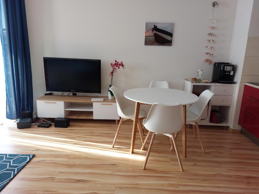 W apartamencie zapewniono sypialnię (1), łazienkę (1), pościel, ręczniki, jadalnię oraz kuchnię z pełnym wyposażeniem. Do dyspozycji Gości jest także telewizor z płaskim ekranem z dostępem do kanałów satelitarnych oraz balkon z widokiem na miasto.
