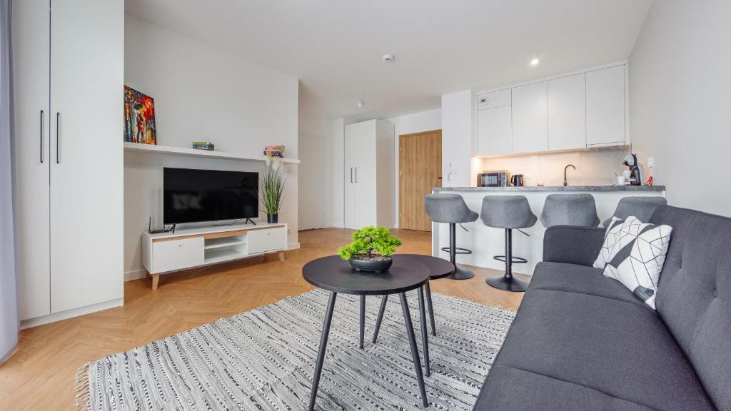 Oferta apartamentu obejmuje sypialnię (1), salon, aneks kuchenny z pełnym wyposażeniem, w tym lodówką i ekspresem do kawy, a także łazienkę (1) z prysznicem oraz suszarką do włosów. Goście mają do dyspozycji telewizor z płaskim ekranem.