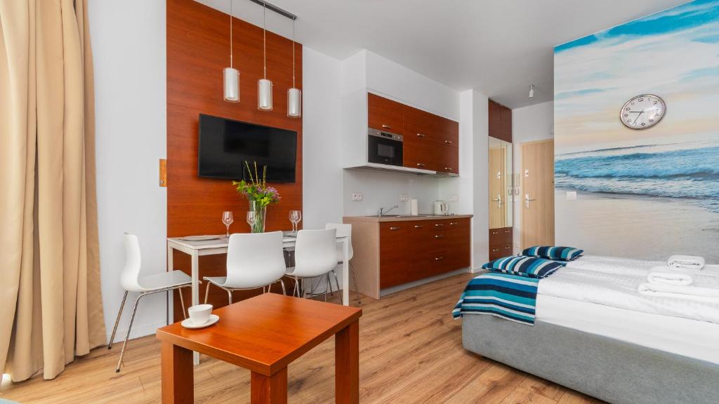 🔷 W apartamentach: salon z aneksem kuchenny, łazienka, sypialnia 🛌