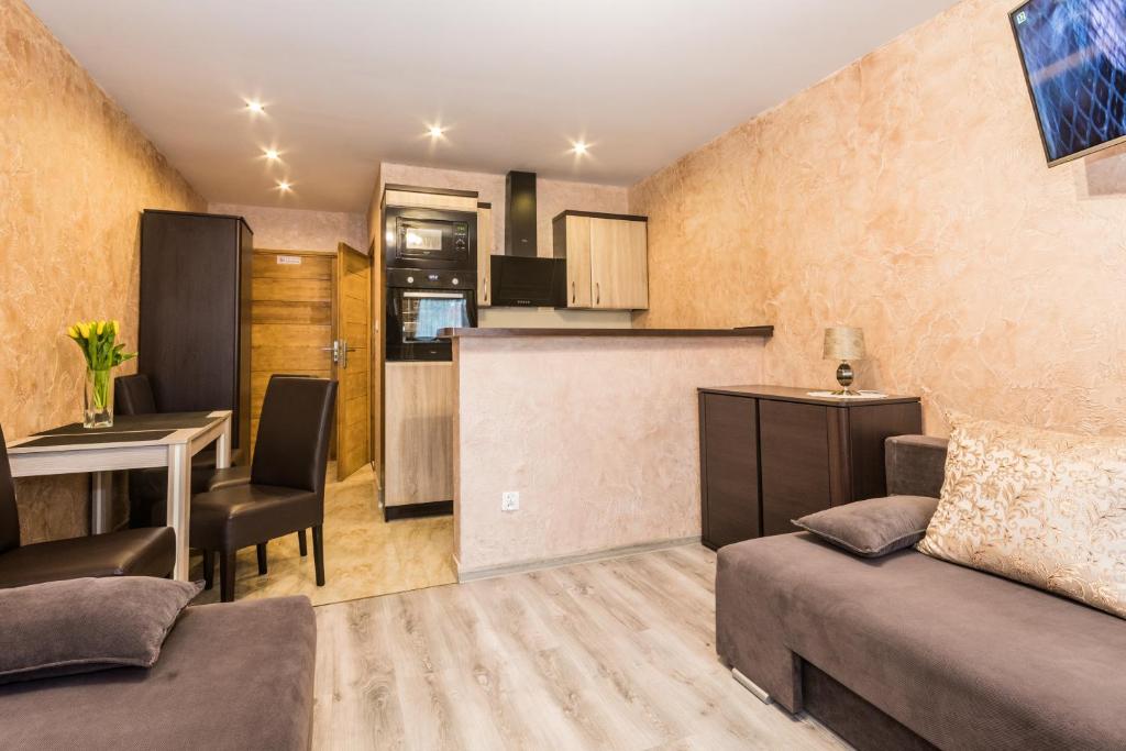 Studio. The studio provides a dining area, a wardrobe, as well as a private bathroom featuring a shower and a hairdryer. The fully equipped kitchen features a stovetop, a refrigerator, kitchenware and an oven. This studio has an electric kettle, a sofa, a flat-screen TV and an outdoor dining area. The unit offers 2 beds. Studio - 4 osobowy. Powierzchnia pokoju ok.: 22 mkw. ;
