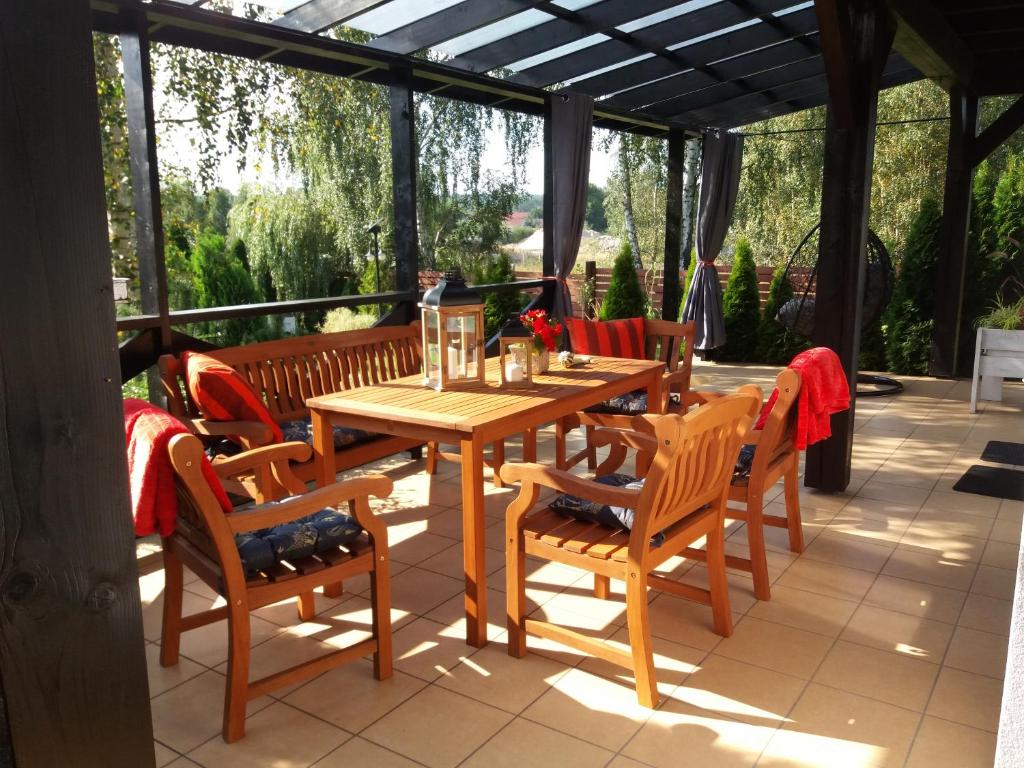 Dom z 3 sypialniami. The fireplace is a top feature of this holiday home. Guests will find a stovetop, a refrigerator, a dishwasher and kitchenware in the well-fitted kitchen. The holiday home also features a barbecue. The spacious holiday home offers air conditioning, a washing machine, a terrace with garden views as well as a shared bathroom boasting a bath. The unit has 6 beds. Dom wakacyjny - 8 osobowy. Powierzchnia pokoju ok.: 130 mkw.