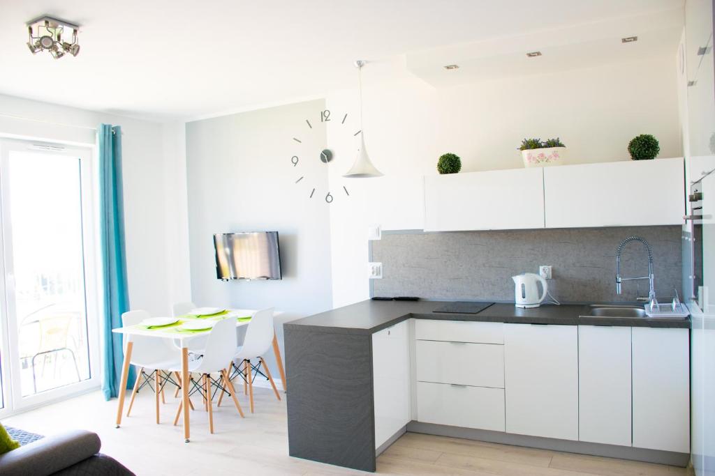 Oferta apartamentu obejmuje sypialnię (1), salon, aneks kuchenny z pełnym wyposażeniem, w tym lodówką i ekspresem do kawy, a także łazienkę (1) z prysznicem oraz suszarką do włosów. W apartamencie zapewniono ręczniki i pościel.