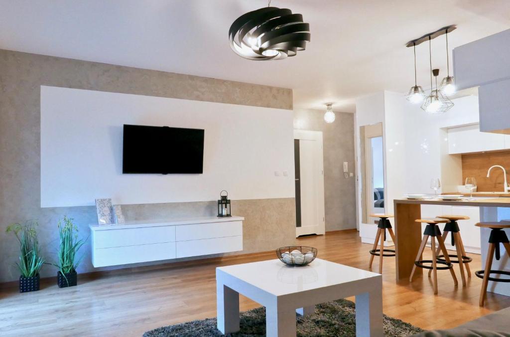 Apartament. This apartment consists of 1 living room, 1 separate bedroom and 1 bathroom with a walk-in shower. Meals can be prepared in the well-fitted kitchenette, which is equipped with a stovetop, a refrigerator, a dishwasher and kitchenware. Featuring a terrace with ancourtyard view, this apartment also provides a washing machine and a flat-screen TV with cable channels. The unit offers 2 beds. Powierzchnia pokoju ok.: 45 mkw.