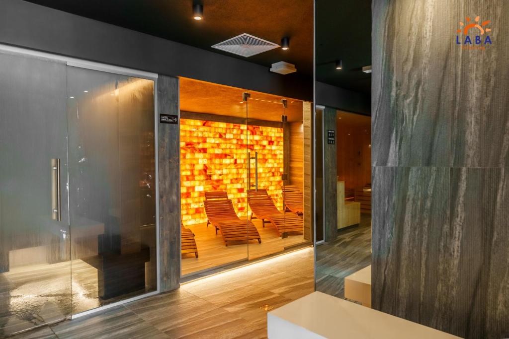 Zaplecze odnowy biologicznej obiektu LABA Kołobrzeg Apartamenty Kasprowicza 20 Parking Basen Fitness Bawialnia w CENIE, Parkplatz Schwimmbad Fitness Spielzimmer im PREIS obejmuje saunę i wannę z hydromasażem.