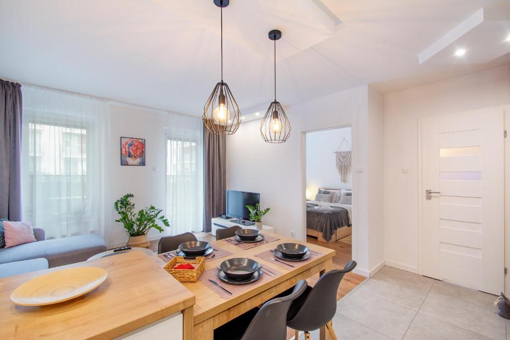 Apartament z 1 sypialnią. Boasting a private entrance, this apartment comes with 1 living room, 1 separate bedroom and 1 bathroom with a walk-in shower and a hairdryer. Guests can make meals in the kitchen that features a stovetop, a refrigerator, a dishwasher and kitchenware. This apartment has a washing machine, flat-screen TV with streaming services, city views, as well as chocolate for guests. The unit has 2 beds. Apartament - 4 osobowy. Powierzchnia pokoju ok.: 42 mkw.