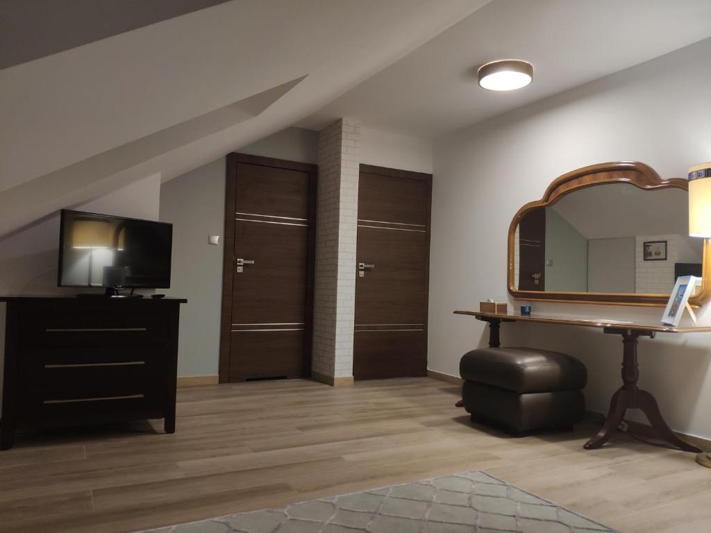 Pokój Trzyosobowy z prywatną łazienką. The triple rooms kitchen, which features a stovetop and kitchenware, is available for cooking and storing food. This triple room has a dining area, a wardrobe and a flat-screen TV. The unit offers 2 beds. Pokój Trzyosobowy - 3 osobowy. Powierzchnia pokoju ok.: 20 mkw. ;