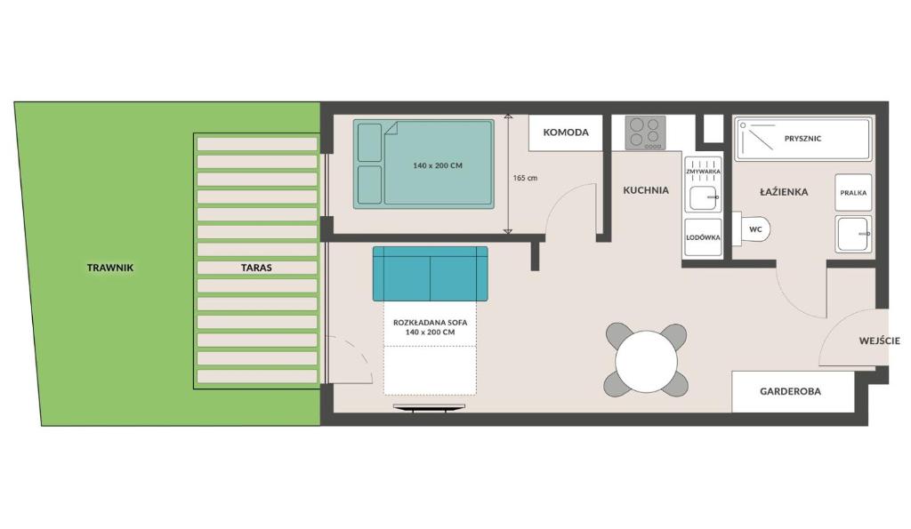Apartament – parter. This apartment comprises 1 living room, 1 separate bedroom and 1 bathroom with a walk-in shower and a hairdryer. In the well-fitted kitchen, guests will find a stovetop, a refrigerator, a dishwasher and kitchenware. Featuring a terrace with garden views, this apartment also provides a washing machine and a flat-screen TV with cable channels. The unit offers 2 beds. Powierzchnia pokoju ok.: 31 mkw.