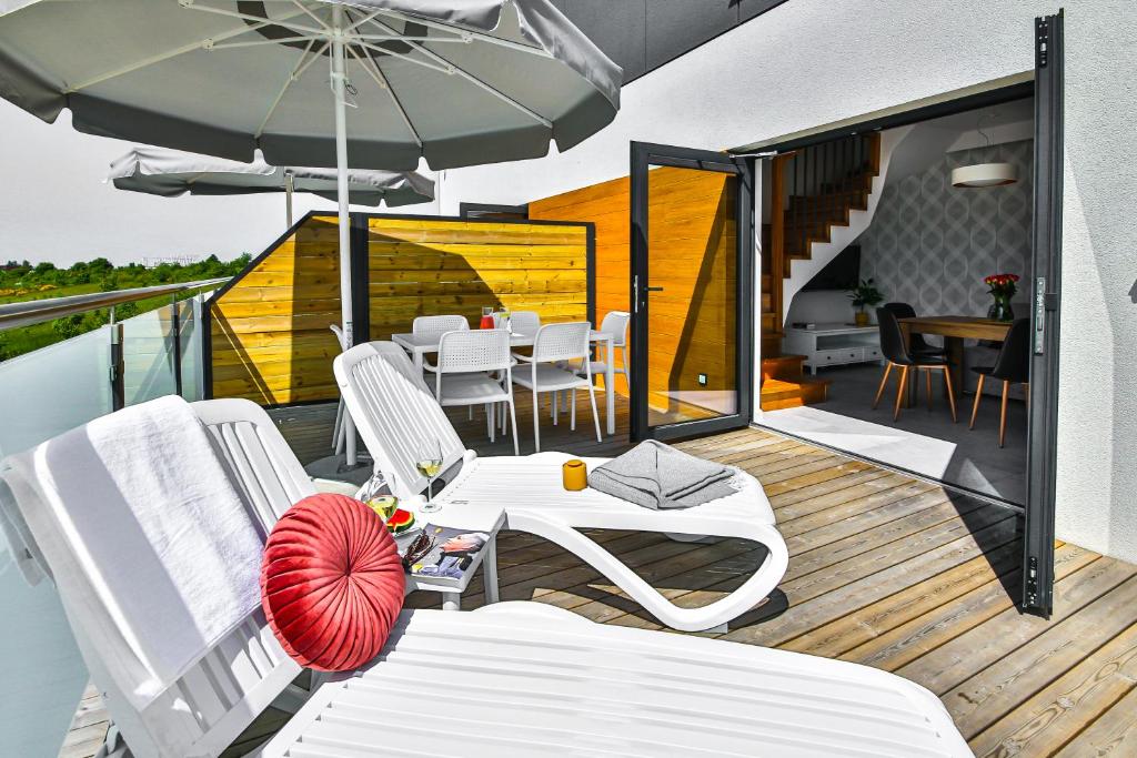 Apartament typu Studio z tarasem. W aneksie kuchennym znajduje się płyta kuchenna, lodówka i przybory kuchenne. To klimatyzowane studio dysponuje łazienką, oddzielnym wejściem oraz tarasem. Dla Gości przygotowano zestaw do parzenia kawy i herbaty. W tej opcji zakwaterowania zapewniono 1 łóżko. Studio - 2 osobowy. Powierzchnia pokoju ok.: 20 mkw. ;