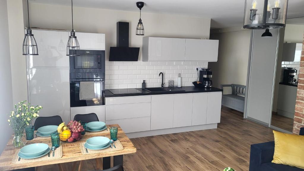 Oferta apartamentu obejmuje sypialnię (1), salon, aneks kuchenny z pełnym wyposażeniem, w tym lodówką i ekspresem do kawy, a także łazienkę (1) z prysznicem oraz suszarką do włosów. W apartamencie zapewniono ręczniki i pościel.