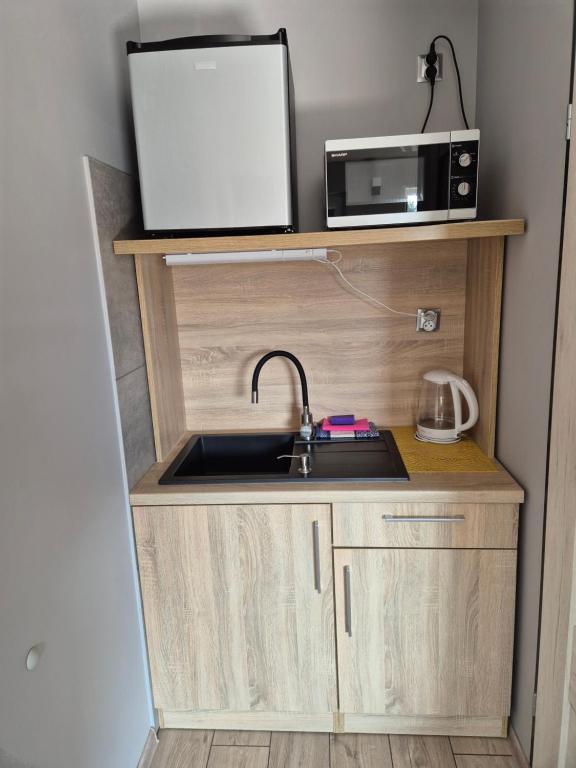 Pokój Czteroosobowy z łazienką. The well-fitted kitchenette features a refrigerator, kitchenware, a microwave and an electric kettle. This air-conditioned quadruple room has a private bathroom, a private entrance, a wardrobe as well as a terrace. The unit has 2 beds. Powierzchnia pokoju ok.: 16 mkw. ;