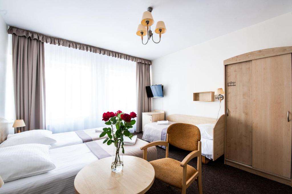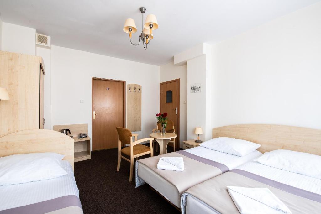 Pokój Trzyosobowy typu Standard. Providing free toiletries, this triple room includes a private bathroom with a shower and a hairdryer. The triple room provides a wardrobe, a safe deposit box, an electric kettle, a carpeted floor and a flat-screen TV with cable channels. The unit offers 3 beds. Pokój Trzyosobowy - 3 osobowy. Powierzchnia pokoju ok.: 23 mkw.