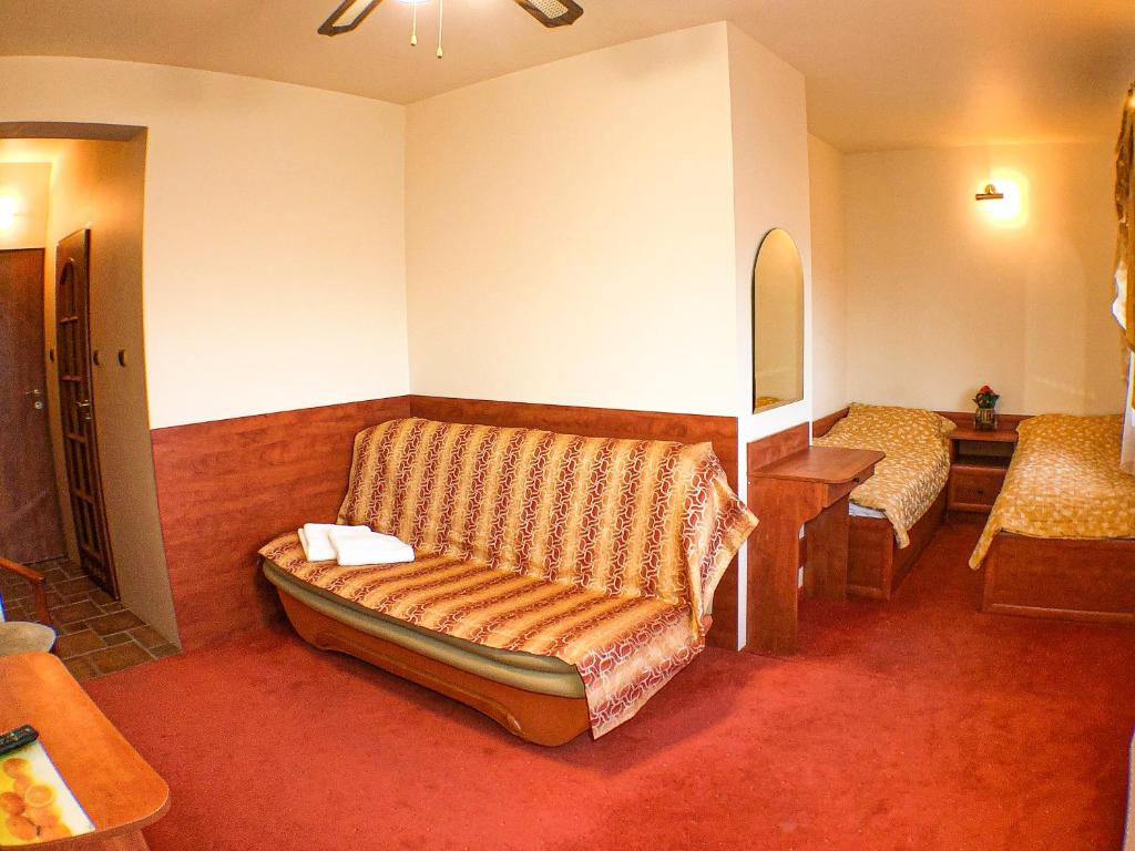Klasycznie urządzone pokoje utrzymane są w ciepłych barwach. Każdy z nich jest wyposażony w czajnik elektryczny, lodówkę oraz przybory kuchenne. Do dyspozycji Gości jest też telewizor i łazienka z prysznicem. Pokoje na pierwszym piętrze mają dostęp do balkonu.