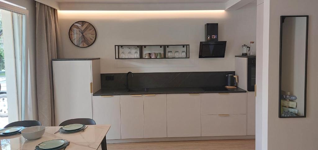 Dom z 2 sypialniami. The fully equipped kitchen features a stovetop, a refrigerator, a dishwasher and kitchenware. The holiday home offers a washing machine, a private entrance, a terrace with garden views as well as a shared bathroom featuring a walk-in shower. The unit offers 5 beds. Dom wakacyjny - 6 osobowy. Powierzchnia pokoju ok.: 61 mkw.