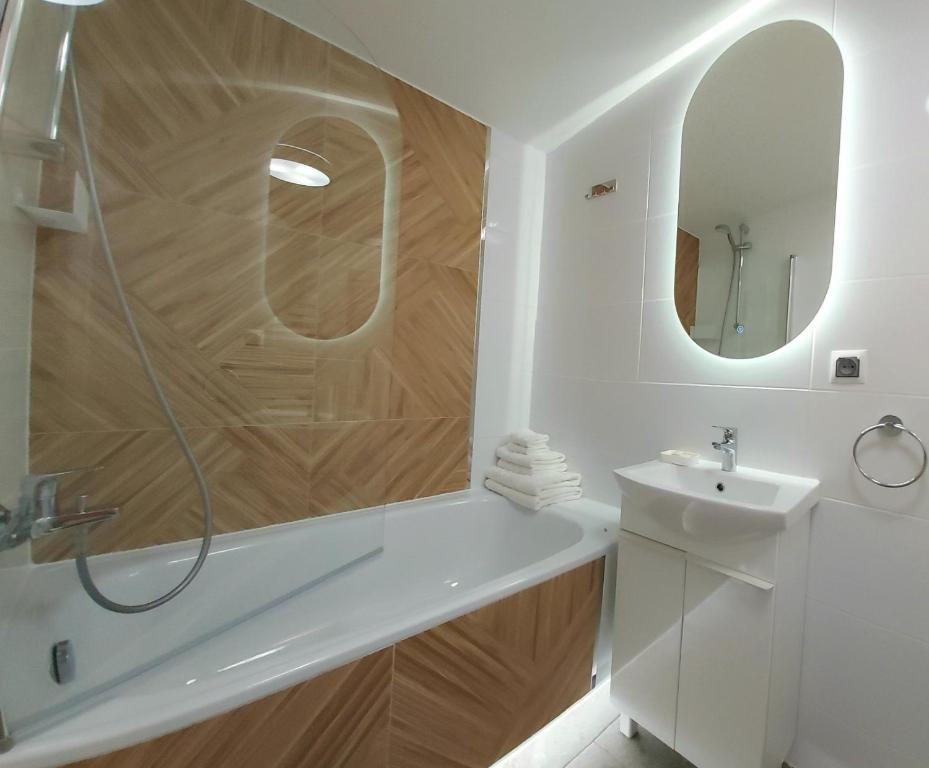 Apartament z 1 sypialnią. Featuring a private entrance, this air-conditioned apartment consists of 1 living room, 1 separate bedroom and 1 bathroom with a bath and a shower. The fully equipped kitchen features a stovetop, a refrigerator, a dishwasher and kitchenware. The apartment provides a washing machine, a tea and coffee maker, a wardrobe, a dressing room and a flat-screen TV with streaming services. The unit offers 2 beds. Apartament - 4 osobowy. Powierzchnia pokoju ok.: 35 mkw.