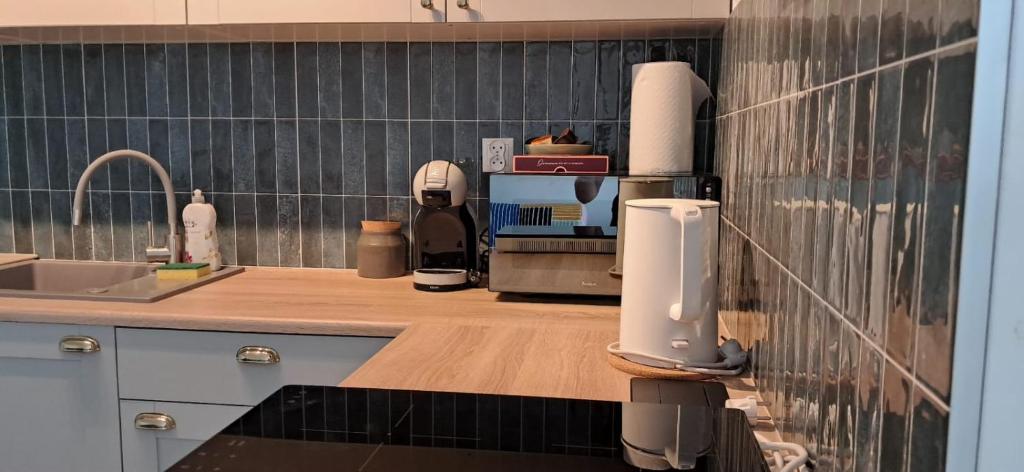 W kuchni 🍽️ znajduje się stół, płyta kuchenna, przybory kuchenne, czajnik elektryczny, kuchenka mikrofalowa, lodówka oraz pralka. Aneks kuchenny jest w pełni wyposażony, aby spełnić potrzeby kulinarne gości.