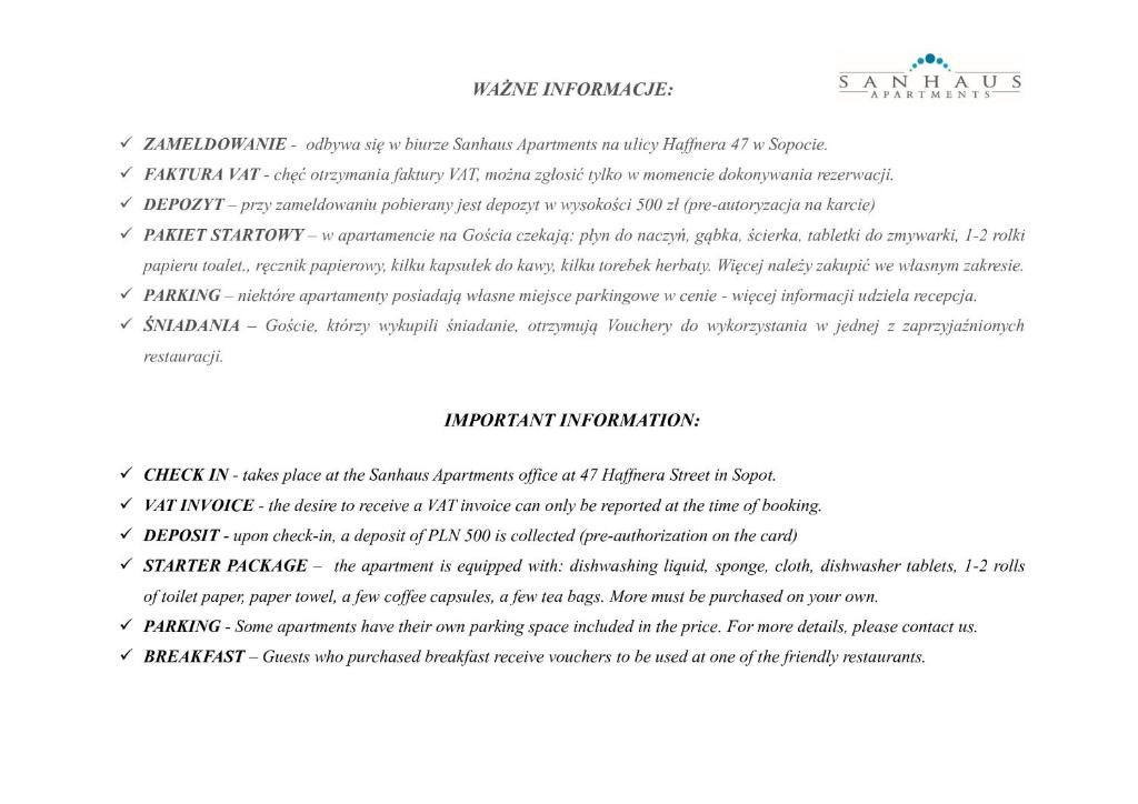 Obiekt Sanhaus Apartments - Apartament SANTORINI - dwie sypialnie, dwie łazienki, klimatyzacja znajduje się w centralnej części miejscowości Sopot i zapewnia bezpłatne Wi-Fi, klimatyzację, a także czajnik oraz zmywarkę. Odległość ważnych miejsc od obiektu: Plaża w Sopocie – 400 m. Odległość ważnych miejsc od apartamentu: Stacja kolejowa Sopot – 700 m, Opera Leśna – 1,7 km.