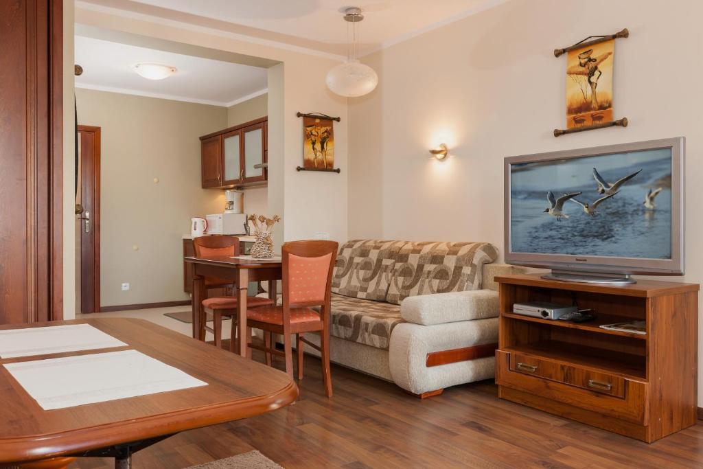 Apartament z balkonem. The apartment features 1 bedroom and 1 bathroom with a shower and free toiletries. Meals can be prepared in the kitchen, which is fitted with a stovetop, a refrigerator, kitchenware and an oven. This apartment has a washing machine, a tea and coffee maker, flat-screen TV with satellite channels, as well as chocolate for guests. The unit offers 3 beds. Apartament - 5 osobowy. Powierzchnia pokoju ok.: 37 mkw.