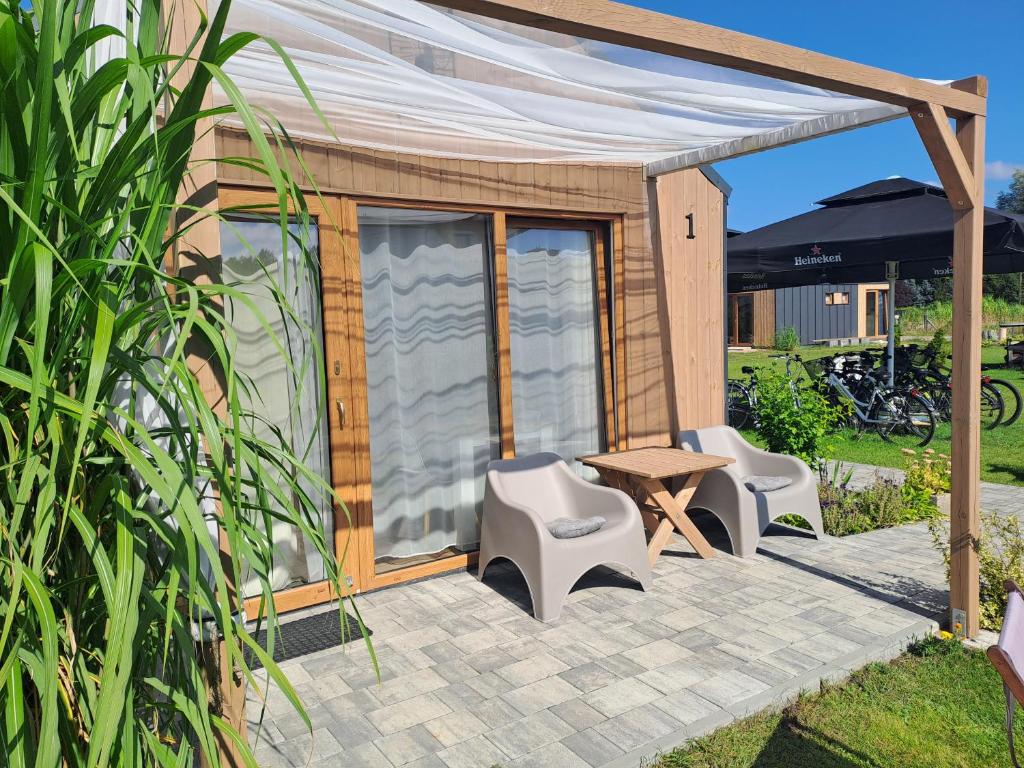 Domek. Boasting a private entrance, this chalet also comes with 1 living room, 1 separate bedroom and 1 bathroom with a shower. Featuring a terrace with garden views, this chalet also features a tea and coffee maker and a flat-screen TV with satellite channels. The unit has 1 bed. Domek - 2 osobowy. Powierzchnia pokoju ok.: 20 mkw. ;