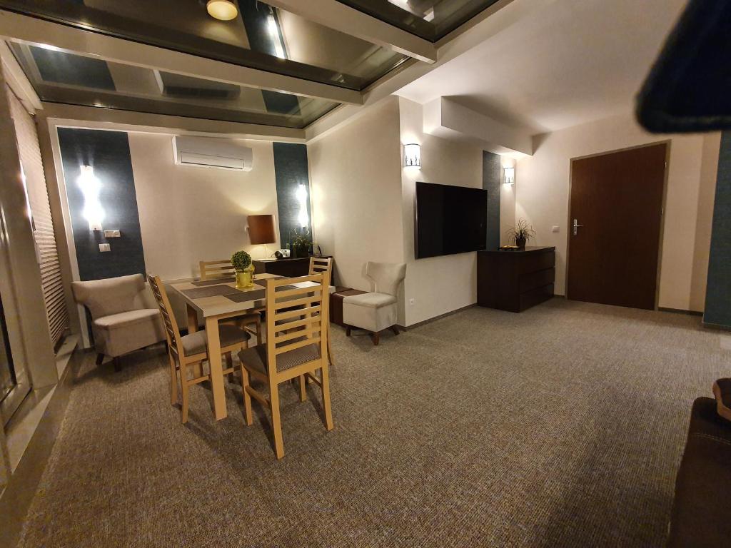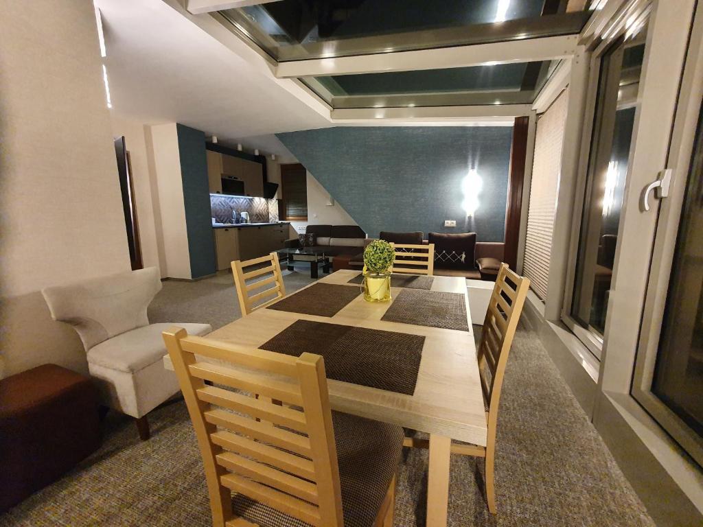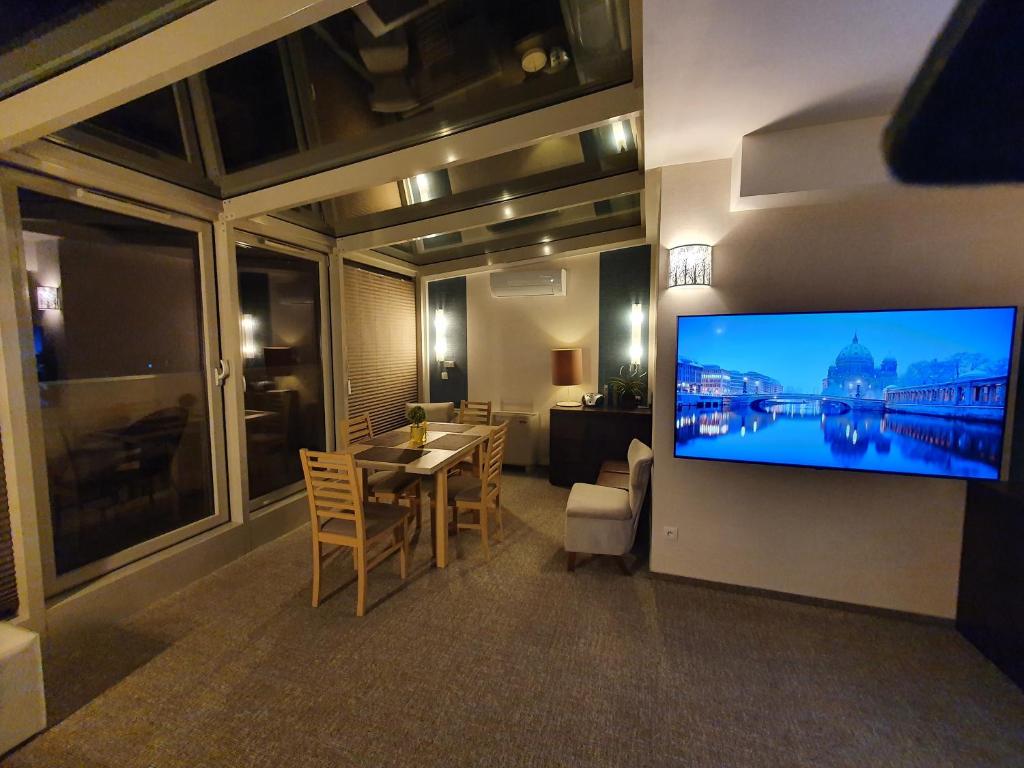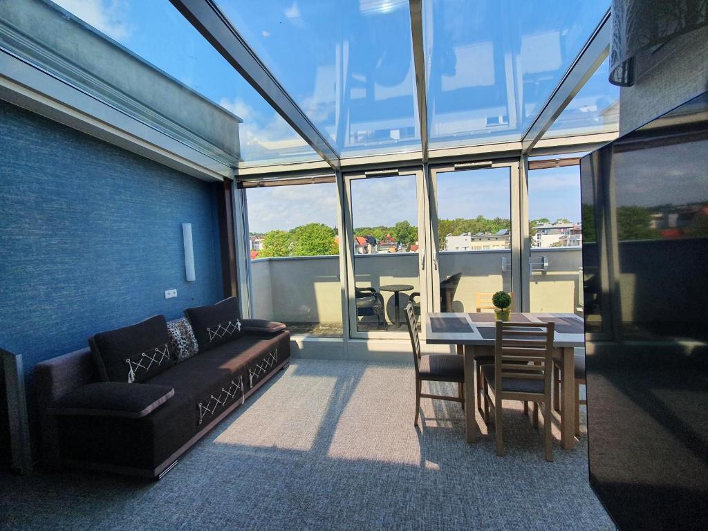 Apartament typu Penthouse. Ten klimatyzowany apartament z oddzielnym wejściem jest wyposażony w czajnik elektryczny. W salonie znajduje się część wypoczynkowa oraz aneks kuchenny pod przeszklonym dachem. Apartament - 5 osobowy. Powierzchnia pokoju ok.: 52 mkw.