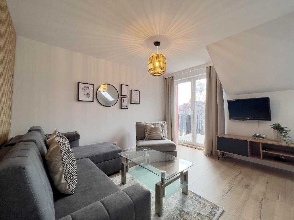 Apartament z tarasem. Featuring a private entrance, this apartment is comprised of 1 living room, 1 separate bedroom and 1 bathroom with a shower and a hairdryer. The well-fitted kitchen features a stovetop, a dishwasher, kitchenware and a microwave. Boasting a balcony with garden views, this apartment also offers a seating area and a flat-screen TV. The unit offers 2 beds. Apartament - 3 osobowy. Powierzchnia pokoju ok.: 35 mkw.