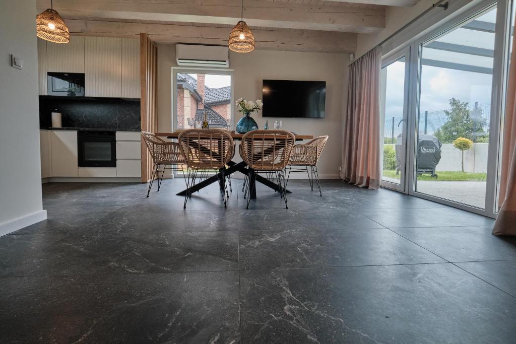 Dom wakacyjny. Boasting a private entrance, this air-conditioned holiday home features 1 living room, 2 separate bedrooms and 1 bathroom with a shower and a hairdryer. Guests will find a stovetop, a refrigerator, a dishwasher and kitchenware in the kitchenette. The holiday home also comes with a barbecue. This holiday home has a tea and coffee maker, a dining area, a flat-screen TV with streaming services and a terrace. The unit has 3 beds. Dom wakacyjny - 6 osobowy. Powierzchnia pokoju ok.: 75 mkw.